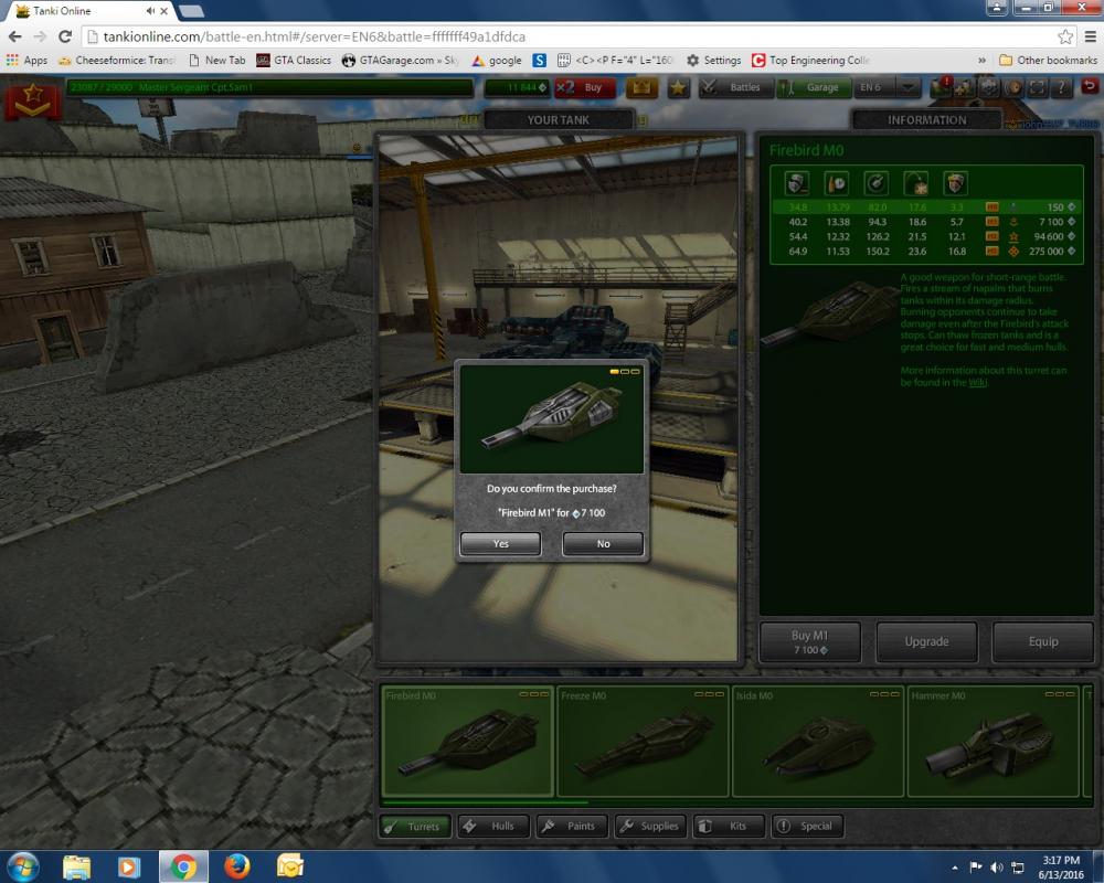 2) I started playing this game 3 years ago. I stopped playing this 2 years ago and i started playing it again. Between these 2 years. i used to connect to the game and log off once in a month so i will get 2200 crystals everytime. that was the only way of earning crystals cuz my computer was lagging so much that i wanted to throw the whole thing out of my house. when i got a total of 11 thousand i bought firebird m1. i had this rank : \*/. the red star over the golden arrow towards the downside.i also bought lava paint. then after 4 months when i looked the firebird was m0. I had a doubt whether i upgraded it or not. then i did it again. then i started collecting collecting it and made it 11 thousand then i left it. i thought i stopped this game forever. Then after a long time i started playing this game after tanki's birthday. It was on june 11. I got a free premium account for 1 week i think so. When i went back to the garage. i had to buy that again. This is the third time buying firebird m1.:post-458675-0-20407200-1466406659_thumb.jpg