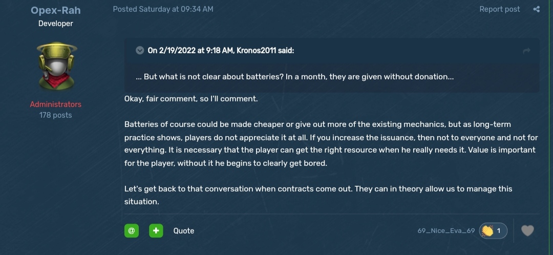 I'm not really bothered by that because I don't think players being able to hoard so many batteries and other supplies what was the devs wanted, but new players are never going to get enough batteries to compete with older players that have benefited from the old economy so much